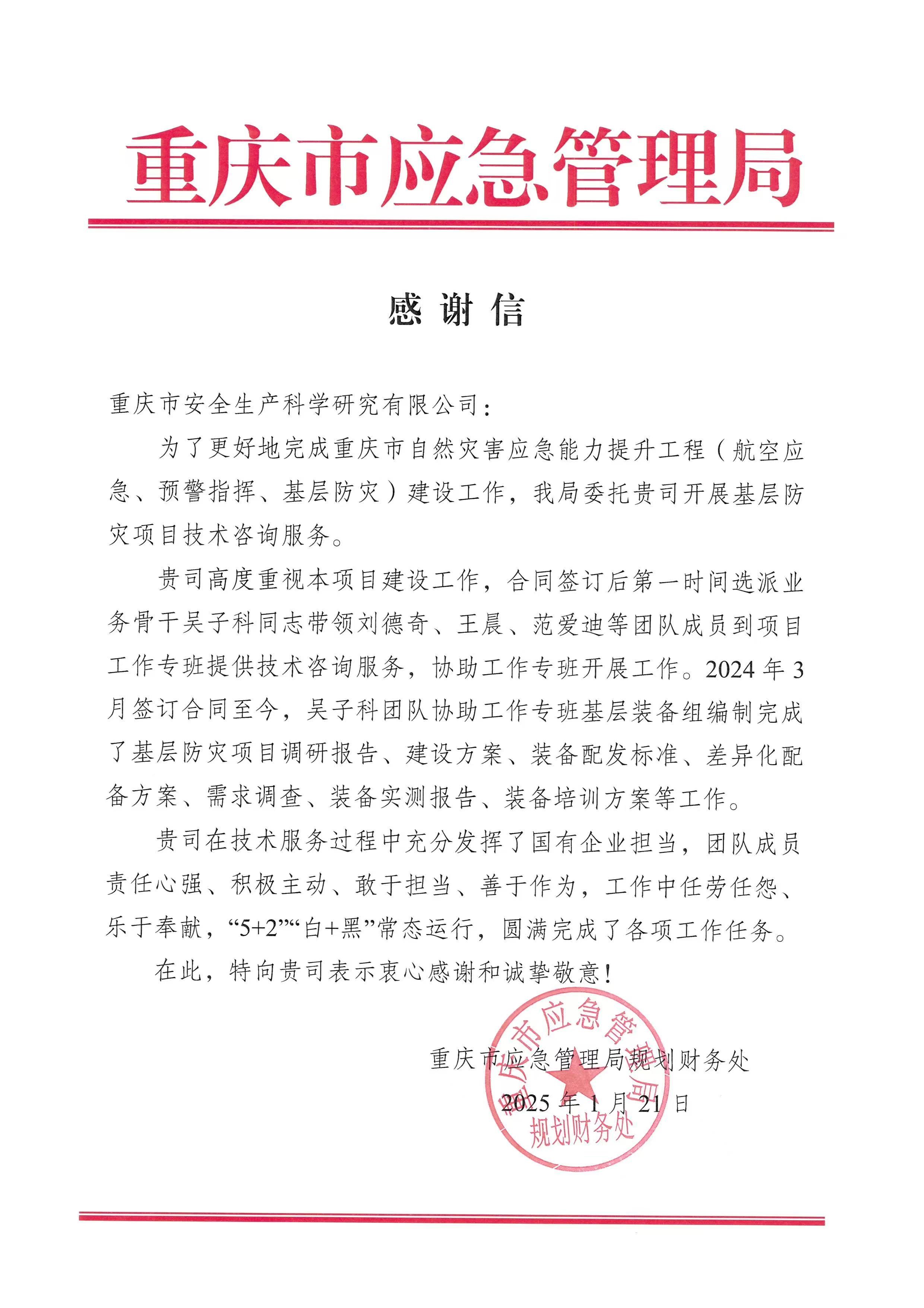 重慶市應(yīng)急管理局就國債項目技術(shù)支撐服務(wù)工作向公司致